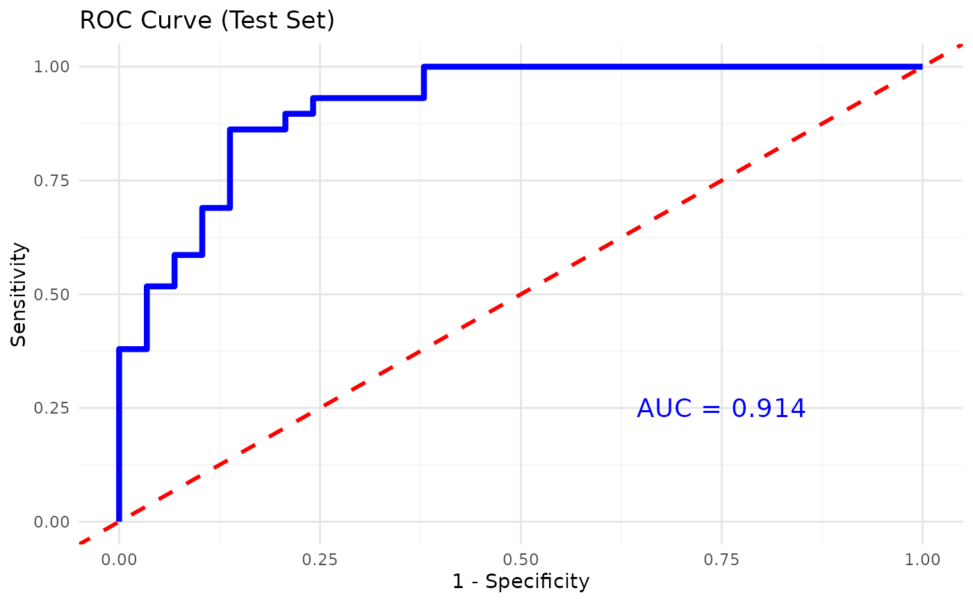 #> [1] "### XGBOOST RESULTS ###\n\n1) Group -> Numeric Label Mapping:\nPreT2D T2D \n 0 1 \n\n2) Confusion Matrix on Test Set:\n Reference\nPrediction 0 1\n 0 25 7\n 1 4 22\n\nTest Accuracy: 0.81 \n\nSensitivity: 0.862069 \nSpecificity: 0.7586207 \n\nAUC: 0.914 \n\n3) Top 10 Important Features:\n Feature Gain Cover Frequency\n <char> <num> <num> <num>\n 1: TNF.A 0.18457678 0.10535233 0.09103448\n 2: IL.22 0.15117263 0.16064281 0.09885057\n 3: IL.12.P70 0.09955532 0.12855158 0.12321839\n 4: IL.33 0.09384522 0.08514973 0.07908046\n 5: IL.1B 0.07717208 0.03835908 0.05149425\n 6: IL.9 0.07554566 0.06955229 0.07080460\n 7: IL.15 0.04705740 0.05853239 0.03310345\n 8: IL.23 0.04440949 0.02533791 0.02988506\n 9: CCL.20.MIP.3A 0.03678675 0.05623800 0.05287356\n10: IL.13 0.02785650 0.02633047 0.03678161"